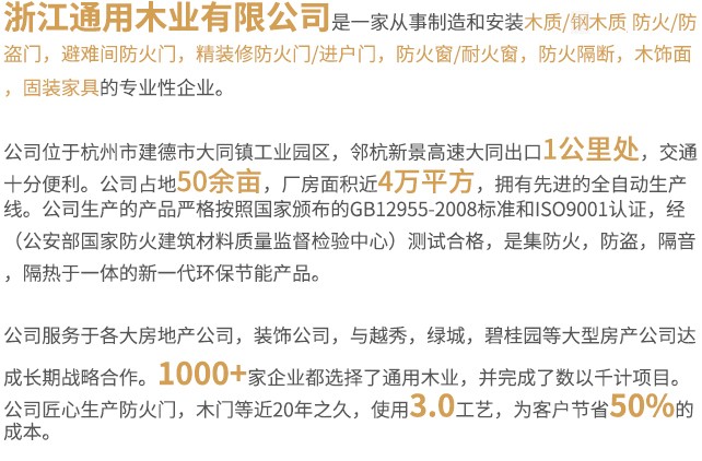 浙江通用木业有限公司是专业从事制造和安装钢木质精装进户门和防火门的专业型企业。公司位于建德大同工业园区,邻杭新景高速1公里处,交通十分便利。公司占地50亩,厂房面积达3万平方